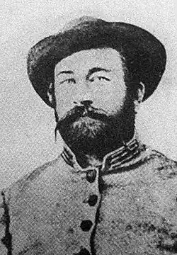 Stuart was promoted to captain on April 22, 1861, but resigned from the U.S. Army on May 3, 1861, to join the Confederate States Army, following the secession of Virginia.[c] On June 26, 1860, Flora gave birth to a son, Philip St. George Cooke Stuart, but Stuart changed the name to James Ewell Brown Stuart Jr. ("Jimmie"), in late 1861 out of disgust with his father-in-law.[26] Upon learning that his father-in-law, Col. Cooke, would remain in the U.S. Army during the coming war, Stuart wrote to his brother-in-law (future Confederate Brig. Gen. John Rogers Cooke), "He will regret it but once, and that will be continuously." When he learned that George H. Thomas, a fellow Virginian, had also decided to stay with the Union, Stuart wrote "I would like to hang, hang Thomas as a traitor to his native state."[27]