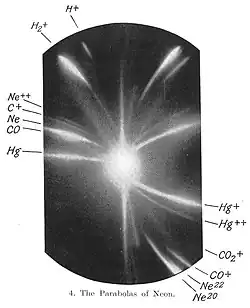 Thomson's separation of neon isotopes by their mass was the first example of mass spectrometry, which was subsequently improved and developed into a general method by F. W. Aston and by A. J. Dempster.[4][6]