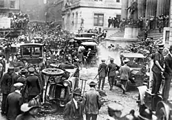 Built in 1914, 23 Wall Street was the bank's headquarters for decades.[27] On September 16, 1920, a terrorist bomb exploded in front of the bank, injuring 400 and killing 38.[28] Shortly before the bomb went off, a warning note was placed in a mailbox at the corner of Cedar Street and Broadway. The case has never been solved, and was rendered inactive by the FBI in 1940.[29]