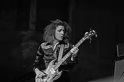 Bruce's complex, jazz-influenced playing established him as one of the foremost bassists in rock music. During his time with Cream, he developed his signature style and began to make use of string bending and bass distortion to stand out in the band, becoming prominently associated with the Gibson EB-3 and Marshall amplification. Later, he switched to fretless Warwick basses and developed a cleaner sound utilizing Hartke amplifiers.[34] Uniquely amongst his contemporaries, Bruce was primarily a fingerstyle player, in contrast to other bassists like John Entwistle or Noel Redding who mainly relied on using a pick.