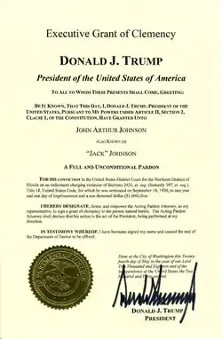 - ^ Eligon, John; Shear, Michael D. (May 24, 2018). "Trump Pardons Jack Johnson, Heavyweight Boxing Champion". The New York Times. Retrieved May 26, 2018.