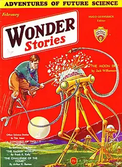 As a child Williamson enjoyed storytelling to his brother and two sisters. As a young man, he discovered the magazine Amazing Stories, established in 1926 by Hugo Gernsback, after answering an ad for one free issue. He strove to write his own fiction and sold his first story to Gernsback at age 20: "The Metal Man" was published in the December 1928 issue of Amazing.[1] During the next year Gernsback published three more of his stories in the new pulp magazines Science Wonder Stories and Air Wonder Stories, and separately published "The Girl from Mars" by Miles J. Breuer and Williamson as Science Fiction Series #1.[1] His work during this early period was heavily influenced by A. Merritt,[5] author of The Metal Monster (1920) and other fantasy serials. Noting the Merritt influence, Algis Budrys described "The Metal Man" as "a story full of memorable images".[6]