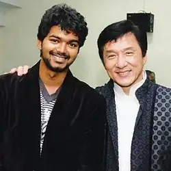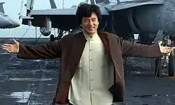 Chan gained Hollywood success for portraying Chief Inspector Lee in the American buddy cop action comedy film Rush Hour (1998), a role he reprised in two sequels. He went on to work both in American and Chinese films, appearing in the Shanghai film series (2000–2003), New Police Story (2004), Rob-B-Hood (2006), Little Big Soldier (2010), Shaolin (2011), and The Shadow's Edge (2025), among others. The Forbidden Kingdom (2008) marked his first collaboration with fellow martial arts star Jet Li. He has played martial arts mentor Mr. Han in two Karate Kid films, the 2010 remake The Karate Kid and Karate Kid: Legends (2025). For CZ12 (2012), he earned two Guinness World Records for "Most Stunts Performed by a Living Actor" and "Most Credits in One Movie". He played against type in Shinjuku Incident (2009) and The Foreigner (2017).[9][10] His voice acting work includes all three Chinese versions of Mulan (1998), the first three films in the Kung Fu Panda franchise (2008–2016), and Teenage Mutant Ninja Turtles: Mutant Mayhem (2023).