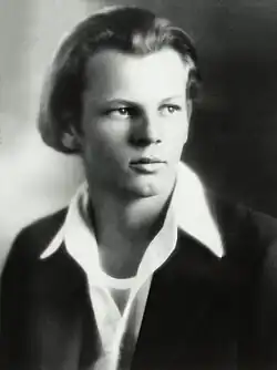 Paul Jackson Pollock was born in Cody, Wyoming, on January 28, 1912,[4] the youngest of five brothers. His parents, Stella May (née McClure) and LeRoy Pollock, were born and grew up in Tingley, Iowa, and were educated at Tingley High School. Stella is interred at Tingley Cemetery, Ringgold County, Iowa. His father had been born with the surname McCoy, but he took the surname of his adoptive parents. Stella and LeRoy Pollock were Presbyterian; they were of Irish and Scots-Irish descent, respectively.[5] LeRoy was a farmer and later a land surveyor for the government, moving for different jobs.[4] Stella, proud of her family's heritage as weavers, made and sold dresses as a teenager.[6] In November 1912, Stella took her sons to San Diego; Jackson was just 10 months old and would never return to Cody.[6] He subsequently grew up in Arizona and Chico, California.
