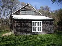 Pollock and Lee Krasner met while they both exhibited at the McMillen Gallery in 1942. Krasner was unfamiliar yet intrigued with Pollock's work and went to his apartment, unannounced, to meet him following the gallery exhibition.[32] In October 1945, Pollock and Krasner were married in a church with two witnesses present for the event.[33] In November, they moved out of the city to the Springs area of East Hampton on the south shore of Long Island. With the help of a down-payment loan from Peggy Guggenheim, they bought a wood-frame house and barn at 830 Springs Fireplace Road. Pollock converted the barn into a studio. In that space, he perfected his "drip" technique of working with paint, with which he would become permanently identified. When the couple found themselves free from work, they enjoyed spending their time together cooking and baking, working on the house and garden, and entertaining friends.[34]