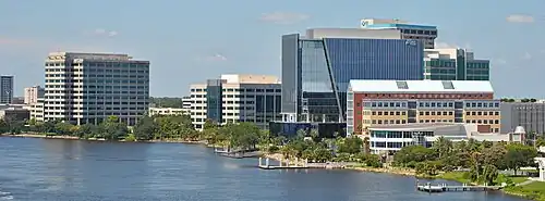 Jacksonville's early predominant position as a regional center of business left an indelible mark on the city's skyline. Many of the earliest skyscrapers in the state were constructed in Jacksonville, dating to 1902.[71] The city last held the state height record from 1974 to 1981.[72] The tallest building in Downtown Jacksonville's skyline is the Bank of America Tower, constructed in 1990 as the Barnett Center. It has a height of 617 ft (188 m) and includes 42 floors.[73][74] Other notable structures include the 37-story 1 Independent Square (with its distinctive flared base making it the defining building in the Jacksonville skyline),[75][76] originally built in 1972–1974 by the Independent Life and Accident Insurance Company, and the 28-floor Riverplace Tower. When this tower was completed in 1967, it was the tallest precast, post-tensioned concrete structure in the world.[77][78]