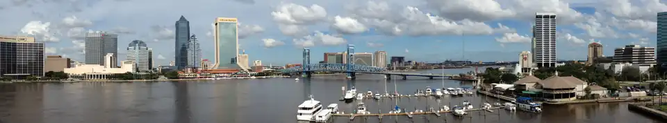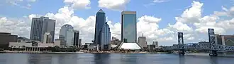 Downtown Jacksonville skyline with Main Street Bridge and St. Johns River Port of Jacksonville Dames Point Bridge Prime F. Osborn III Convention Center James Weldon Johnson Park Memorial Park Florida Theatre EverBank Stadium | |