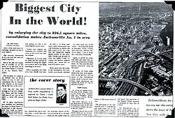 When a consolidation referendum was held in 1967, 65% of voters approved the plan. On October 1, 1968, the city and county governments merged to create the Consolidated City of Jacksonville. Fire, police, health & welfare, recreation, public works, and housing & urban development were all combined under the new government. In honor of the occasion, then-Mayor Hans Tanzler posed with actress Lee Meredith behind a sign marking the new border of the "Bold New City of the South" at Florida 13 and Julington Creek.[55] The consolidation created a 900-square-mile entity.