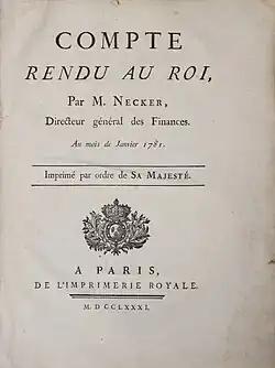 By 1781, France was suffering financially, and, as director-general of the royal treasury, he was blamed for the rather high debt accrued from the American Revolution.[28] A series of pamphlets appeared, criticizing Necker.[29] Jacques-Mathieu Augeard attacked him on his foreign origin, his faith, and economic choices.[29] The main reason behind this was the action of Necker "cooking the books" or falsifying the records.[30][28] He brightened the picture by excluding military outlays and other 'extraordinary' charges (Menus-Plaisirs du Roi) and ignoring the national debt.[31][32] Both Necker and Calonne were deceived with the number of pensions and gratifications.[33] The king spent much more on his brothers than on public health. After Necker had shown Louis XVI his annual report, the king tried to keep its contents secret. Necker met the challenge aggressively by asking the King to bring him into the royal council. In revenge, Necker made the Compte rendu au roi public; in no time between 200,000 copies were sold.[7] It was rapidly translated into Dutch, German, Danish, Italian and English.