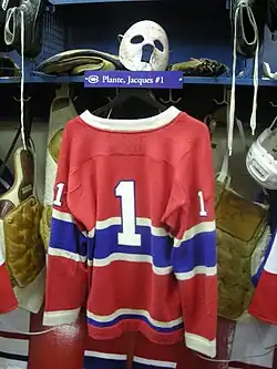 Plante was the first NHL goaltender to wear a goaltender mask in regulation play on a regular basis.[4] He developed and tested many versions of the mask (including the forerunner of today's mask/helmet combination) with the assistance of other experts. Plante was the first NHL goaltender to regularly play the puck outside his crease in support of his team's defencemen, and he often instructed his teammates from behind the play. Plante was inducted into the Hockey Hall of Fame in 1978, was chosen as the goaltender of the Canadiens' "dream team" in 1985, and was inducted into the Quebec Sports Pantheon in 1994. The Montreal Canadiens retired Plante's jersey, #1, the following year. Plante ranks seventh among NHL goalies for all-time career wins with 437.