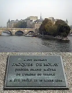 Marker at the site of Jacques de Molay's execution in Paris. (Translation: At this location, Jacques de Molay, last Grand Master of the Knights Templar, was burned on 18 March 1314), located by the stairs from the Pont-Neuf bridge. The top half of this photo shows the part of the island where the executions took place. The lower half shows the plaque, which is on one of the pillars of the bridge, behind the trees.