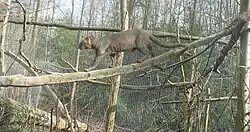 The jaguarundi is shy and reclusive, and apparently very cautious of traps.[47] There have been only a few radio telemetry studies of jaguarundis in Belize, Brazil and Mexico.[35] Though activity has been observed throughout the day and at night, jaguarundis seem to prefer hunting during daytime and evening hours; for instance, a study in Belize reported that jaguarundis started moving before dawn and remained active through most of the day till sunset with a peak in hunting from late morning to noon.[10][49] The cat appears to be more diurnal than most other cats, especially spotted cats that tend to be more active at night.[36][34] The jaguarundi can swim across medium-sized rivers; one in Bolivia was recorded swimming across the Tuichi River.[35] Jaguarundis are efficient climbers as well, but hunt mainly on ground; the coat color works as a good camouflage for terrestrial activity.[36] They can leap up to 2 m (6 ft 7 in) into the air to catch birds.[34] Predators recorded for jaguarundis include boa constrictors, cougars and domestic dogs.[35] Parasites such as hookworms (Ancylostoma species), tapeworms (such as Spirometra and Toxocara species) and the lung fluke have been found in jaguarundis.[10]