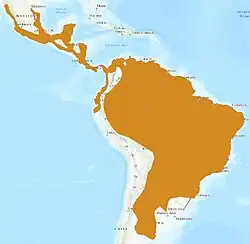 The range extends from central Argentina in the south to northern Mexico, through Central and South America east of the Andes, second only to the cougar among cats in the latitudinal extent of its distribution. However, not all parts of its range have been studied well. The jaguarundi is fairly common in Brazil, Peru, and Venezuela.[42] It is possibly extirpated in the United States;[1] a 1999 study refuted claims of sightings in Arizona, in the Huachuca Mountains in Santa Cruz County.[43] The last specimen collected in the U.S. was a roadkill near Brownsville, Texas, in 1986.[42] In 1994, the jaguarundi was thought to be represented in the lower Rio Grande Valley by no more than 15 individuals, and its survival there was doubtful.[44] It was declared extinct in Texas in 2025,[45] but is thought to still be present in Santa Ana National Wildlife Refuge.[46]