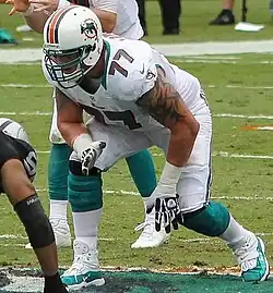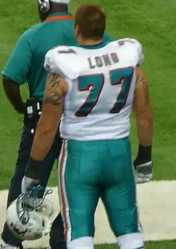 More than two weeks before the 2008 NFL draft, the Miami Dolphins, who owned the right to make the first selection in the draft determined that they wanted to negotiate with Long to be their pick and met with Tom Condon, Long's sports agent.[124] On April 22, 2008, in advance of the April 26 and 27 draft, Long agreed to a five-year, $57.75 million deal with the Miami Dolphins. The deal included $30 million in guaranteed money and made Long the first overall pick in the 2008 NFL Draft.[125] This made him, as of that date, the highest paid offensive lineman in NFL history.[126] At Dolphins minicamp on May 2, Long was assigned number 79 and he thought he would have to negotiate with Drew Mormino for the number 77 that he had worn since high school.[127] However, after he failed his physical exam, Mormino was released from the team,[128] and before training camp Long was assigned number 77.[129]