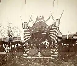 Garfield took up the practice of law in 1865 to improve his personal finances. His efforts took him to Wall Street where, the day after Lincoln's assassination, a riotous crowd drew him into an impromptu speech to calm their passions: "Fellow citizens! Clouds and darkness are round about Him! His pavilion is dark waters and thick clouds of the skies! Justice and judgment are the establishment of His throne! Mercy and truth shall go before His face! Fellow citizens! God reigns, and the Government at Washington still lives!"[86] The speech, with no mention or praise of Lincoln, was, according to Garfield biographer Robert G. Caldwell, "quite as significant for what it did not contain as for what it did."[87] In the following years, Garfield had more praise for Lincoln; a year after Lincoln's death, Garfield said, "Greatest among all these developments were the character and fame of Abraham Lincoln," and in 1878 he called Lincoln "one of the few great rulers whose wisdom increased with his power".[88]