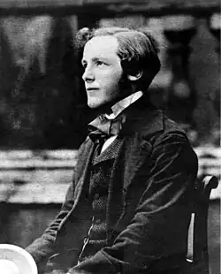 In 1841, at age ten, Maxwell was sent to the prestigious Edinburgh Academy.[27] He lodged during term times at the house of his aunt Isabella. During this time his passion for drawing was encouraged by his older cousin Jemima.[28] The young Maxwell, having been raised in isolation on his father's countryside estate, did not fit in well at school.[29] The first year had been full, obliging him to join the second year with classmates a year his senior.[29] His mannerisms and Galloway accent struck the other boys as rustic. Having arrived on his first day of school wearing a pair of homemade shoes and a tunic, he earned the unkind nickname of "Daftie".[30] He never seemed to resent the epithet, bearing it without complaint for many years.[31] Social isolation at the Academy ended when he met Lewis Campbell and Peter Guthrie Tait, two boys of a similar age who were to become notable scholars later in life. They remained lifelong friends.[13]