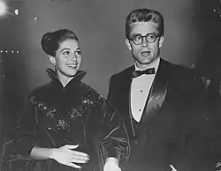 After finishing his role for East of Eden, Dean took a brief trip to New York in October 1954.[75] While he was away, Angeli unexpectedly announced her engagement to Italian-American singer Vic Damone. The press was shocked and Dean expressed his irritation. Angeli married Damone the following month. Gossip columnists reported that Dean watched the wedding from across the road on his motorcycle, even gunning the engine during the ceremony. William Bast wrote that Dean had actually gone so far as to hire a stand-in to ride a Harley-Davidson motorcycle to the church where Angeli and Vic Damone were married, and that after the ceremony when the couple came out of the church to be showered with rice, the double gunned the engine in front of a crowd of press photographers for dramatic effect and rode off.[78] Angeli, who later divorced Damone and then her second husband, the Italian film composer Armando Trovajoli, was said by friends in her last years to claim that Dean was the love of her life. She died from an overdose of barbiturates in 1971 at the age of 39.[85] Dean also dated Swiss actress Ursula Andress.[86] "She was seen riding around Hollywood on the back of James's motorcycle," writes biographer Darwin Porter. She was also seen with Dean in his sports cars and was with him on the day he bought the car he died in.[87]