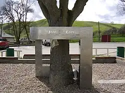 On October 11, after deliberating only twenty minutes, the inquest jury returned a verdict that stated, "We find no indication that James Dean met death through any criminal act of another, and that he died of a fractured neck and other injuries received."[116] There is a James Dean monument made of stainless steel, built in Japan and brought to the site by a Japanese businessman, Seiti Ohnishi, in 1977.[117] It is located in front of the former Cholame post office.[118][119]