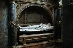 Montrose's limbs were brought from the towns to which they had been sent (Glasgow, Perth, Stirling and Aberdeen) and placed in his coffin, as he lay in state at Holyrood. A splendid funeral was held in the church of St. Giles on 11 May 1661.[32][33]