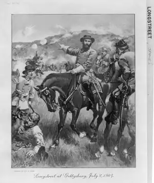 Longstreet's actions at the Battle of Gettysburg would become the centerpiece of lasting controversy.[161] Longstreet arrived on the battlefield at about 4:30p.m on the first day, July 1, 1863, hours ahead of his troops. Lee had not intended to fight before his army was fully concentrated, but chance and decisions by A.P. Hill, whose troops were the first to be engaged, brought on the confrontation. The battle on the first day was a strong Confederate victory. Two Union corps had been driven by Ewell and Hill from their positions north of Gettysburg back through the town into defensive positions on the heights to the south. Meeting with Lee, Longstreet was concerned about the strength of the Union defensive position on elevated ground and advocated a strategic movement around their left flank, to "secure good ground between him and his capital", which would presumably compel Meade to attack defensive positions erected by the Confederates.[162][163][164] Instead, Lee exclaimed, "If the enemy is there tomorrow, I will attack him." Longstreet replied, "If he is there tomorrow it is because he wants you to attack."[165] Lee, energized by the success of his army that day, again refused. Longstreet suggested an immediate assault on the federal positions, but Lee insisted on waiting for Hood and McLaws, who were marching towards Gettysburg on the Chambersburg Pike. Longstreet sent a courier down the Cashtown Road to hurry them along. They eventually bivouacked about four miles (6.4 km) behind the lines. Pickett was performing rearguard duty in Cashtown and would not be ready to move until morning. A major blunder occurred when Ewell failed to seize the heights on Cemetery Hill after being ordered to do so "if practicable" by Lee.[166][167][168]