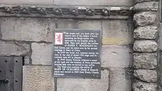 James V renewed the Auld Alliance and fulfilled the terms of the Treaty of Rouen on 1 January 1537 by marrying Madeleine at Notre-Dame de Paris. James received papal approval in the form of the Blessed sword and hat, and was granted the title of Defender of the Faith by Pope Paul III on 19 January 1537, symbolising the hopes of the papacy that he would resist the path that his uncle Henry VIII had followed.[52][53] After months of festivities and celebrations, and visits to Chantilly, Compiègne and Rouen (where Madeleine fell ill), the royal couple embarked for Scotland in May 1537, arriving at Leith on 19 May.[54] Madeleine wrote to her father from Edinburgh on 8 June 1537 saying that she was better and her symptoms had diminished.[55] However, a month later, on 7 July 1537, Queen Madeleine died in her husband's arms at Holyrood Palace of tuberculosis. James V wrote to Francis I to inform him of what had happened, saying that if it were not for the fact that he was relying on the French king to remain his "good father", he would be in even greater pain. The Queen was interred in Holyrood Abbey in Edinburgh.[56]