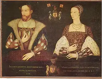 The proxy wedding of James V and Mary of Guise was held on 9 May 1538 at the Château de Châteaudun. Some 2,000 Scottish lords and barons came from Scotland aboard a fleet of ships under Lord Maxwell to attend, with Lord Maxwell standing as proxy for James V. Mary departed from Le Havre on 10 June 1538, and landed in Scotland 6 days later at Crail in Fife. She was formally received by the king at St Andrews a few days later amid pageants and plays performed in her honour, and James and Mary were married in person at St Andrews Cathedral on 18 June 1538. James's mother Margaret Tudor wrote to Henry VIII in July, "I trust she will prove a wise Princess. I have been much in her company, and she bears herself very honourably to me, with very good entertaining."[59] James and Mary had two sons: James, Duke of Rothesay (born 22 May 1540 at St Andrews), and Robert (or Arthur), Duke of Albany (born and baptised on 12 April 1541); however, both died on 21 April 1541, when James was nearly one year old and Robert (or Arthur) was nine days old. Mary's mother, Antoinette de Bourbon, wrote that the couple were still young and should hope for more children.[60] The third and last child of the union was a daughter, Mary, who was born on 8 December 1542.[61]