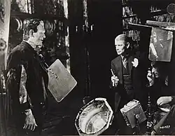In 1931, Universal chief Carl Laemmle, Jr. offered Whale his choice of any property the studio owned. He chose Frankenstein, mostly because none of Universal's other properties particularly interested him, and he wanted to make something other than a war picture.[39] While Mary Shelley's 1818 novel Frankenstein; or, The Modern Prometheus itself was in the public domain, Universal owned the filming rights to a stage adaptation by Peggy Webling. Whale cast Colin Clive as Henry Frankenstein and Mae Clarke as his fiancée Elizabeth. For the Monster, he turned to the little known Boris Karloff, who had wide-ranging experience in supporting roles. Shooting began on 24 August 1931 and wrapped on 3 October.[40] Previews were held 29 October,[41] with wide release on 21 November.[42] Frankenstein was an instant hit with critics and the public. The film received glowing reviews and shattered box office records across the United States,[43] earning Universal $12 million on first release.[40]