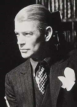 Whale's last professional engagement was directing Pagan in the Parlour, a farce about two New England spinster sisters who are visited by a Polynesian whom their father, when shipwrecked years earlier, had married. The production was mounted in Pasadena for two weeks in 1951. Plans were made to take it to New York, but Whale suggested taking the play to London first.[82] Before opening the play in England, Whale decided to tour the art museums of Europe. In France he renewed his acquaintanceship with Curtis Harrington, whom he had met in 1947. While visiting Harrington in Paris, he went to some gay bars. At one he met a 25-year-old bartender named Pierre Foegel,[6] whom Harrington believed was nothing but "a hustler out for what he could get".[45] The 62-year-old Whale was smitten with the younger man and hired him as his chauffeur.[83]