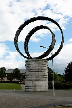 A memorial sculpture was erected for Whale in September 2001 on the grounds of a new multiplex cinema in his home town of Dudley. The sculpture, by Charles Hadcock, depicts a roll of film with the face of Frankenstein's monster engraved into the frames, and the names of his most famous films etched into a cast concrete base in the shape of film canisters. Other sculptures related to Whale's cinema career were planned, referencing his early work in a local sheet metal factory, but none had been installed as of 2019.[124]