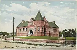 In 1887, Jamestown Electric Light and Power Company, Art Metal, and WCA Hospital were established. In 1888, Jamestown Woolen Spinning Co. was established and the cornerstone of Holy Trinity Lutheran Church laid. In 1889, the American Aristotype Co. was established.[8] The first electric trolley car in Jamestown made its appearance in 1890. In 1891, a fire destroyed the Old Homestead Hotel at Third and Pine Streets and four people died, but the James Prendergast Library and the Municipal Light Plant were established the same year.[8]