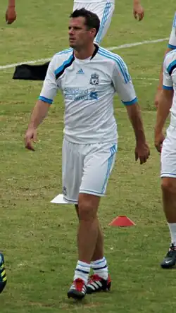Carragher attended the FA's School of Excellence in Lilleshall as a youth.[8] He joined Liverpool, Everton's Merseyside rivals, in 1988; he regularly attended Liverpool's School of Excellence wearing a Graeme Sharp Everton kit.[9] He spent a year at the Everton School of Excellence at the age of 11, but returned to Liverpool due to the club's superior coaching set-up under Steve Heighway.[10] He failed to impress in his first appearances to the Liverpool A and B teams due to his then-small stature, but after being moved from up front to a midfield role he was able to establish himself in the reserve team.[11] He played his first game for the reserves in the 1994–95 season, and was named man of the match against Blackburn Rovers at Haig Avenue.[12] He helped Liverpool to win the 1996 FA Youth Cup with a 4–1 aggregate victory over a West Ham United side that included Rio Ferdinand and Frank Lampard.[13]