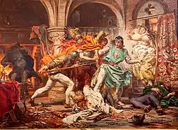 At a young age he witnessed the Kraków revolution of 1846 and the 1848 siege of Kraków by the Austrians, two events which put an end to the Free City of Kraków.[2] Two of his older brothers served in both armed conflicts, under General Józef Bem. One of them, Edmund, fell in battle and the other was forced into exile.[2] Matejko attended St. Anne's High School, but he dropped out in 1851 because of poor grades. Matejko showed an early artistic talent, but had great difficulty with other academic subjects.[10] He never fully mastered a foreign language.[11] Despite that, and because of his exceptional skill, at the age of fourteen he entered the School of Fine Arts in Kraków, where he was a contemporary of Artur Grottger from 1852 to 1858.[2] His teachers included Wojciech Korneli Stattler and Władysław Łuszczkiewicz.[12] He opted for historical painting as his specialism, and finished his first major work, The Shuyski Tsars before Zygmunt III (Carowie Szujscy przed Zygmuntem III), in 1853 (he would return to this theme a year before his death, in 1892.[13][12][14] During this time, he began exhibiting historical paintings at the Kraków Society of Friends of Fine Arts from 1855.[14] His graduation project in 1858 was Sigismund I the Old ennobles professors of the Jagiellonian University (Zygmunt I nadaje szlachectwo profesorom Uniwersytetu Jagiellońskiego) and proved to be seminal.[15]