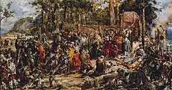 In 1872, during an exhibition in Prague he was offered the directorship of the Prague Academy of Fine Arts, quickly followed by a similar offer from the Kraków School of Fine Arts.[23] He accepted the Kraków position, and was for many years its principal (rector).[23] In 1874, he finished Zawieszenie dzwonu Zygmunta (The Hanging of the Sigismund bell).[26] In 1878, he produced another masterpiece, The Battle of Grunwald.[24] That year he received an "honorary grand gold" medal in Paris, while Kraków city council presented him with a ceremonial scepter, as a symbol of his "royal status in fine art".[24] In 1879 came his Rok 1863 - Polonia (The Year 1863 - Polonia), his depiction of the January Uprising. Begun in 1864 as the Uprising was waning, he abandoned the canvas for a number of years, perhaps due to the loss of several close friends and family members in the conflict. It languished unfinished until prince Władysław Czartoryski became interested in acquiring it. To this day it is considered unfinished.[16][27][28]