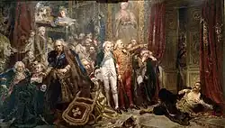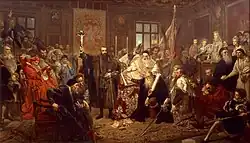 In 1887 Matejko received an honorary doctorate from the Jagiellonian University, and recognition from the Austrian Society, Litteris et Artibus.[29] In 1888 he completed The Battle of Racławice (Bitwa pod Racławicami).[29] In 1888-1899, to justify his new academic title, he published a group of twelve drawings with accompanying commentary, The History of civilisation in Poland (Dzieje Cywilizacji w Polsce).[26][29] Between 1890 and 1892, he published a series of works on paper, portraying all the monarchs of Poland (Poczet królów i książąt polskich - The kings and princes of Poland, including queens), whose popularity turned them into the canon portrayals of their subjects.[29][33] 1891 marked his Constitution of the 3 May (Konstytucja 3 Maja).[29] He went on to compose another large scale work, The Oaths of Jan Kazimierz (Śluby Jana Kazimierza), but death intervened.[29] In 1892, a year before his death, he completed his Self-portrait (Autoportret).[29]