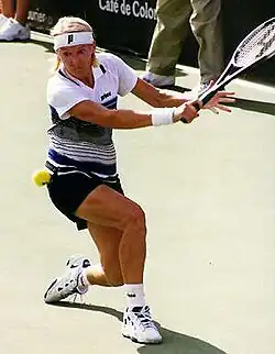 Jana Novotná (Czech pronunciation: [ˈjana ˈnovotnaː]; 2 October 1968 – 19 November 2017) was a Czech professional tennis player. She was ranked world No. 2 in women's singles by the Women's Tennis Association (WTA) in 1997, and as the world No. 1 in women's doubles for 67 weeks.[1] Novotná won the women's singles title at Wimbledon in 1998, and was runner-up in three other singles majors. She also won twelve major women's doubles titles (completing a double career Grand Slam), four major mixed doubles titles, and three Olympic medals. Novotná played a serve and volley game, an increasingly rare style of play among women during her career.[2][3]