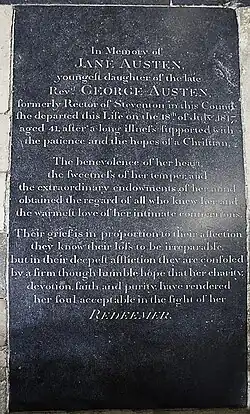 Austen died in Winchester on 18 July 1817 at the age of 41. Henry, through his clerical connections, arranged for his sister to be buried in the north aisle of the nave of Winchester Cathedral. The epitaph composed by her brother James praises Austen's personal qualities, expresses hope for her salvation, and mentions the "extraordinary endowments of her mind", but does not explicitly mention her achievements as a writer.[125]