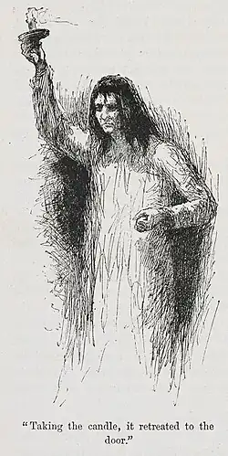 - Bertha Antoinetta Mason: The first wife of Edward Rochester. After their wedding, her mental health began to deteriorate, and she is now violent and in a state of intense derangement, apparently unable to speak or go into society. Mr Rochester, who insists that he was tricked into the marriage by a family who knew Bertha was likely to develop this condition, has kept Bertha locked in the attic at Thornfield Hall for years. She is supervised and cared for by Grace Poole, whose drinking sometimes allows Bertha to escape. After Richard Mason stops Jane and Mr Rochester's wedding, Rochester finally introduces Jane to Bertha: "In the deep shade, at the farther end of the room, a figure ran backwards and forwards. What it was, whether beast or human being, one could not, at first sight, tell… it snatched and growled like some strange wild animal: but it was covered with clothing, and a quantity of dark, grizzled hair, wild as a mane, hid its head and face." Eventually, Bertha sets fire to Thornfield Hall and throws herself to her death from the roof. Bertha is viewed as Jane's "double": Jane is pious and just, while Bertha is savage and animalistic.[15] Though her race is never mentioned, it is sometimes conjectured that she was of mixed race. Rochester suggests that Bertha's parents wanted her to marry him, because he was of "good race", implying that she was not pure white, while he was. There are also references to her "dark" hair and "discoloured" and "black" face.[16] A number of writers during the Victorian period suggested that madness could result from a racially "impure" lineage, compounded by growing up in a tropical West Indian climate.[17][18]