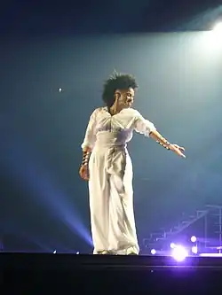 The Janet World Tour launched in support of the studio album garnered criticism for Jackson's lack of vocal proficiency and spontaneity,[81] but earned critical acclaim for her showmanship. It was described as erasing the line between "stadium-size pop music concerts and full-scale theatrical extravaganzas".[82][83]