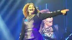 Writing for Time magazine, Jay Cocks observed the show to integrate "sleek high tech and smooth dance rhythm into an evening of snazzy soul with a social conscience."[57] Chris Willman of the Los Angeles Times remarked that Jackson's choreography "represents the pinnacle of what can be done in the popping 'n' locking style—a rapid-fire mixture of rigidly jerky and gracefully fluid movements."[58] Several critics noted Jackson lip synced portions of the show, in a similar fashion to her contemporaries.[59] Jon Pareles commented, "most lip-synched shows are done by video-era pop performers whose audiences are young and television trained. They fill arenas to enjoy a spectacle like what they saw on television—the dancing ... the stage effects and incidentally the songs."[60] Michael MacCambridge considered it a "moot point" stating, "Jackson was frequently singing along with her own pre-recorded vocals, to achieve a sound closer to radio versions of singles."[61]