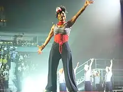 The tour became the most successful debut concert tour in history, with an attendance of over two million.[62] It also set a record for the fastest sell-out of Japan's Tokyo Dome, selling out within seven minutes.[63] Jackson became the only female artist other than Madonna to fill arenas at the time.[64] It was ranked the fifth most successful tour of 1990, making her the only female artist to place within the top ten.[65] It also solidified her reputation as a fashion icon, as fans imitated her "Rhythm Nation" outfit and regalia.[66] Ebony magazine reported "hoards of teen girls were imitating her distinctive look—black quasi-military long jackets, black tight-tight pants, and big white shirts."[67] Joel Selvin of the San Francisco Chronicle wrote "the 23-year-old has been making smash hit records for four years, becoming a fixture on MTV and a major role model to teenage girls across the country."[68] Over $450,000.00 in proceeds from the tour's Madison Square Garden show were used to establish the Rhythm Nation scholarship program.[69] The annual scholarship awards $5,000.00 to students majoring in performing arts and communications at United Negro College Fund member colleges and universities.[70] William Allen, then-executive vice president of the UNCF, remarked: "Jackson is a role model for all young people to emulate and the message she has gotten to the young people of this country through the lyrics of 'Rhythm Nation 1814' is having positive effects."[71]