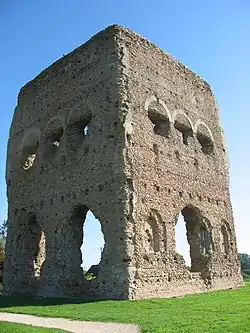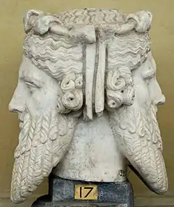 Geminus is the first epithet in Macrobius's list. Although the etymology of the word is unclear,[83] it is certainly related to his most typical character, that of having two faces or heads. The proof are the numerous equivalent expressions.[84] The origin of this epithet might be either concrete, referring directly to the image of the god reproduced on coins[85] and supposed to have been introduced by king Numa in the sanctuary at the lowest point of the Argiletum,[86] or to a feature of the Ianus of the Porta Belli, the double gate ritually opened at the beginning of wars,[87] or abstract, deriving metaphorically from the liminal, intermediary functions of the god themselves: both in time and space passages connected two different spheres, realms or worlds.[88] The Janus quadrifrons or quadriformis, brought according to tradition from Falerii in 241 BC[89] and installed by Domitian in the Forum Transitorium,[90] although having a different meaning, seems to be connected to the same theological complex, as its image purports an ability to rule over every direction, element and time of the year. It did not give rise to a new epithet though.[91][92]