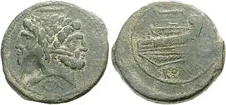 The connection of the notions of beginning (principium), movement, transition (eundo), and thence time was clearly expressed by Cicero.[35] In general, Janus is at the origin of time as the guardian of the gates of Heaven: Jupiter himself can move forth and back because of Janus's working.[36] In one of his temples, probably that of Forum Holitorium, the hands of his statue were positioned to signify the number 355 (the number of days in a lunar year), later 365, symbolically expressing his mastership over time.[37] He presides over the concrete and abstract beginnings of the world,[38] such as religion and the gods themselves,[39] he too holds the access to Heaven and to other gods: this is the reason why men must invoke him first, regardless of the god they want to pray to or placate.[40] He is the initiator of human life,[41] of new historical ages, and financial enterprises: according to myth he was the first to mint coins and the as, first coin of the liberal series, bears his effigy on one face.[42]