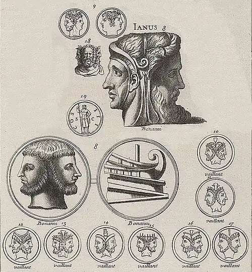 In ancient Roman religion and myth, Janus (/ˈnəs/ JAY-nəs; Latin: Iānus [ˈi̯aːnʊs]) is the god of beginnings, gates, transitions, time, duality, doorways,[2] passages, frames, and endings. He is usually depicted as having a double-sided head. The month of January is named for Janus (Ianuarius).[3] According to ancient Roman farmers' almanacs, Juno was mistaken as the tutelary deity of the month of January,[4] but Juno is the tutelary deity of the month of June.