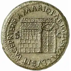 The temple of Janus with closed doors, on a sestertius issued under Nero in 66 AD from the mint at Lugdunum