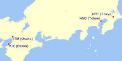Japan Airlines (JAL) is a Japanese airline headquartered in Shinagawa, Tokyo. The airline's main hubs are Tokyo's Narita and Haneda airports, as well as secondary hubs in Osaka's Kansai and Itami airports. The JAL group comprises Japan Airlines, Hokkaido Air System, J-Air, Japan Air Commuter, Japan Transocean Air and Ryukyu Air Commuter for domestic feeder services, and JAL Cargo for cargo and mail services, as well as low-cost carriers Zipair Tokyo and Jetstar Japan.
