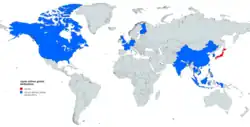 Japan began considering airline deregulation in the late 1970s, with the government announcing the abandoning of the 45/47 system in 1985.[34] In 1987, Japan Airlines was completely privatised, and the other two airlines in Japan, All Nippon Airways and Japan Air System, were permitted to compete with JAL on domestic and international routes. The increased competition resulted in changes to the airline's corporate structure, and it was reorganized into three divisions: international passenger service, domestic passenger service, and cargo (including mail) service.[23][30] In 1988, JAL purchased a 7.5% shareholding in Air New Zealand.[35] This was sold in 1994.[36]