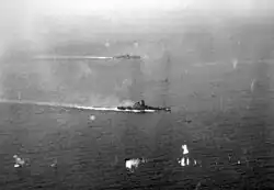 From 20,000 m (22,000 yd), Yamato fired her main guns, immediately hitting Gambier Bay on her first salvo with a 46 cm shell that plunged through her flight deck into her hangar bay.[39] At 08:17, another 46 cm shell smashed through the forward hanger bay.[40] At 08:20, Yamato scored what is commonly attributed as the most fatal hit to the flat top as a 46 cm shell hit Gambier Bay's engine room below the waterline, immediately cutting her speed to 10 knots as she gradually slowed until dead in the water, with Yamato following up with another pair of hits at 08:23.[41] By 08:30, American destroyers covered Gambier Bay, leading to a number of Japanese warships switching fire from the carrier to said destroyers. However, Yamato continued to pound Gambier Bay with her main battery, and observed her listing more and more to port. Meanwhile, her 155 mm secondary guns reengaged Hoel. After Hoel had been scorched by gunfire from Yamato, the battleship Nagato and the heavy cruiser Haguro, Yamato scored a critical hit that disabled Hoel's last boiler, with further gunfire finishing her off by 08:50. Meanwhile, by 08:43 the abandon ship order was issued in Gambier Bay and resulted in Yamato ceasing fire on the now sinking escort carrier.[42]