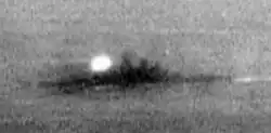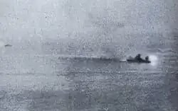 Yamato escorted Transport Operation BO-1 from Truk to Yokosuka during 12–17 December.[23] Subsequently, because of their extensive storage capacity and thick armor protection, Yamato and Musashi were pressed into service as transport vessels.[24] On 25 December, while ferrying troops and equipment—which were wanted as reinforcements for the garrisons at Kavieng and the Admiralty Islands—from Yokosuka to Truk, Yamato and her task group were intercepted by the American submarine Skate about 290 kilometres (180 mi) out at sea.[13][25] Skate fired a spread of four torpedoes at Yamato; one struck the battleship's starboard side toward the stern.[13] A hole 5 metres (16 ft) below the top of her anti-torpedo bulge and measuring some 25 metres (82 ft) across was ripped open in the hull, and a joint between the upper and lower armored belts failed, causing the rear turret's upper magazine to flood.[14] Yamato took on about 3,000 tons of water[14][25] but reached Truk later that day. The repair ship Akashi effected temporary repairs,[22] and Yamato departed on 10 January 1944 for Kure.[25]