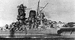 Yamato was again dry-docked at Kure for further upgrades to all her radar and anti-aircraft systems from 25 February to 18 March 1944.[22] Each of the two beam-mounted 155 mm (6.1 in) triple turrets was removed and replaced by three pairs of 127 mm (5.0 in) AA guns in double mounts. In addition, eight triple and twenty-six single 25 mm (0.98 in) AA mounts were added, increasing the total number of 127 mm and 25 mm anti-aircraft guns to 24 and 162, respectively.[18] Shelters were also added on the upper deck for the increased AA crews. A Type 13 air search and Type 22, Mod 4, surface search/gunnery control radar were installed, and the main mast was altered. Her radar suite was also upgraded to include infrared identification systems and aircraft search and gunnery control radars.[22] She left the dry dock on 18 March and went through several trials beginning on 11 April.[25] Yamato left Kure on 21 April and embarked soldiers and materiel the following day at Okinoshima for a mission to Manila, reaching the Philippines on 28 April.[14] She then moved on to Malaya to join Vice Admiral Jisaburo Ozawa's Mobile Fleet at Lingga;[22] this force arrived at Tawi-Tawi on 14 May.[22]