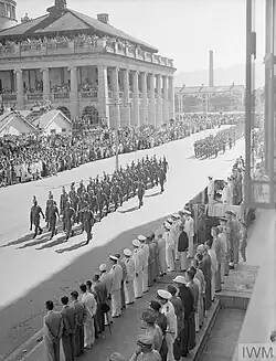 The Japanese occupation of Hong Kong began when the governor of Hong Kong, Mark Aitchison Young, surrendered the British Crown colony of Hong Kong to the Empire of Japan on 25 December 1941. His surrender occurred after 18 days of fierce fighting against the Japanese forces that invaded the territory.[5][6] The occupation lasted for three years and eight months until Japan surrendered at the end of the Second World War. The length of the period (三年零八個月, lit. 'three years and eight months') later became a metonym of the occupation.[6]